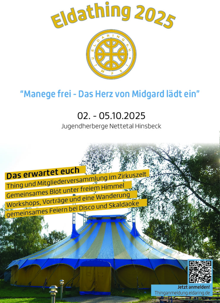Manege frei – Das Herz von Midgard lädt ein” in die Jugendherberge Nettetal-Hinsbeck, Heide 1, 41334 Nettetal vom 02. – 05.10.2025 Hier könnt ihr beim Thing das Schicksal des Rings mitgestalten, ein episches Blót erleben, viele wunderbare Menschen treffen und an Vorträgen, Workshops und den Wikingerspielen teilnehmen. Außerdem gibt’s Disco, Skaldaoke, Bronzegießen, Handpoke-Tattoos und betreutes Whisky-Trinken. Das Anmeldeformular findet ihr unter thinganmeldung.eldaring.de bittet sendet es ausschließlich an thing@eldaring.de